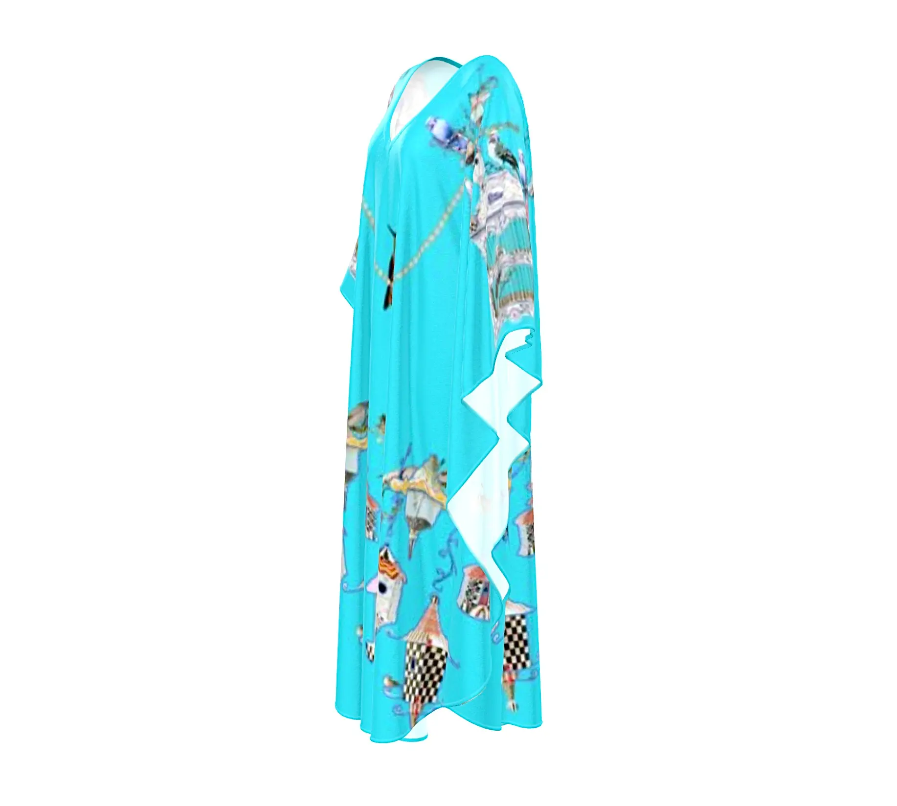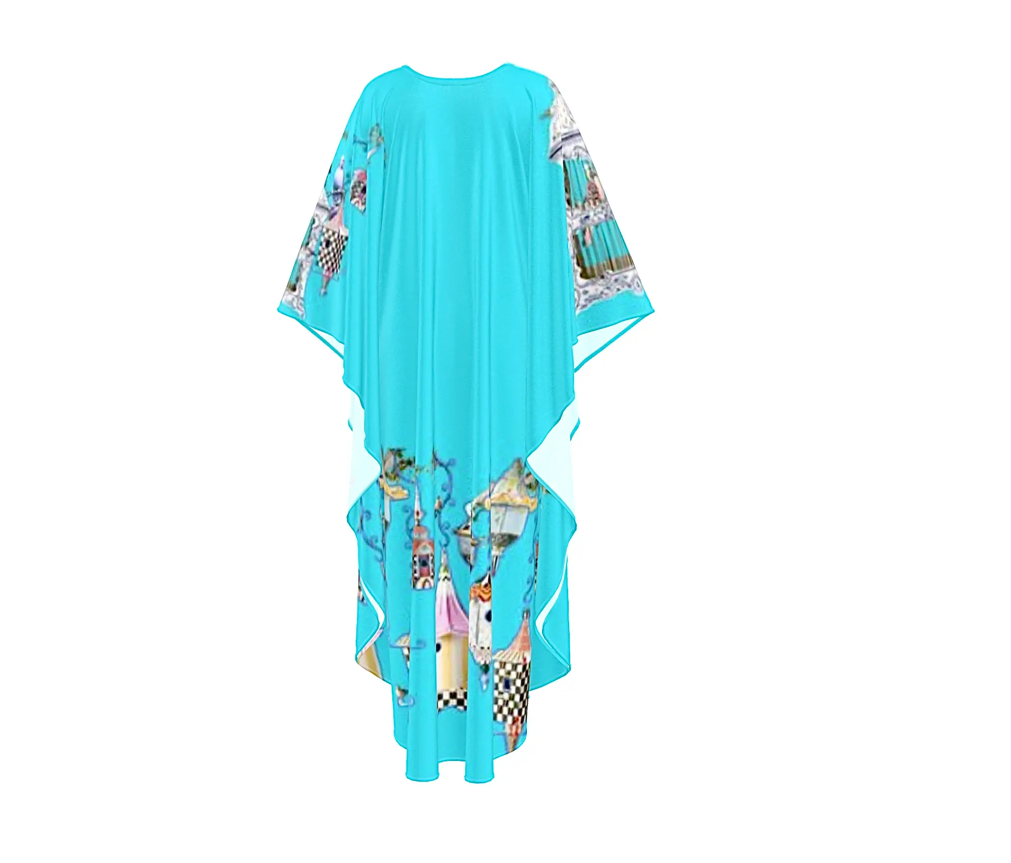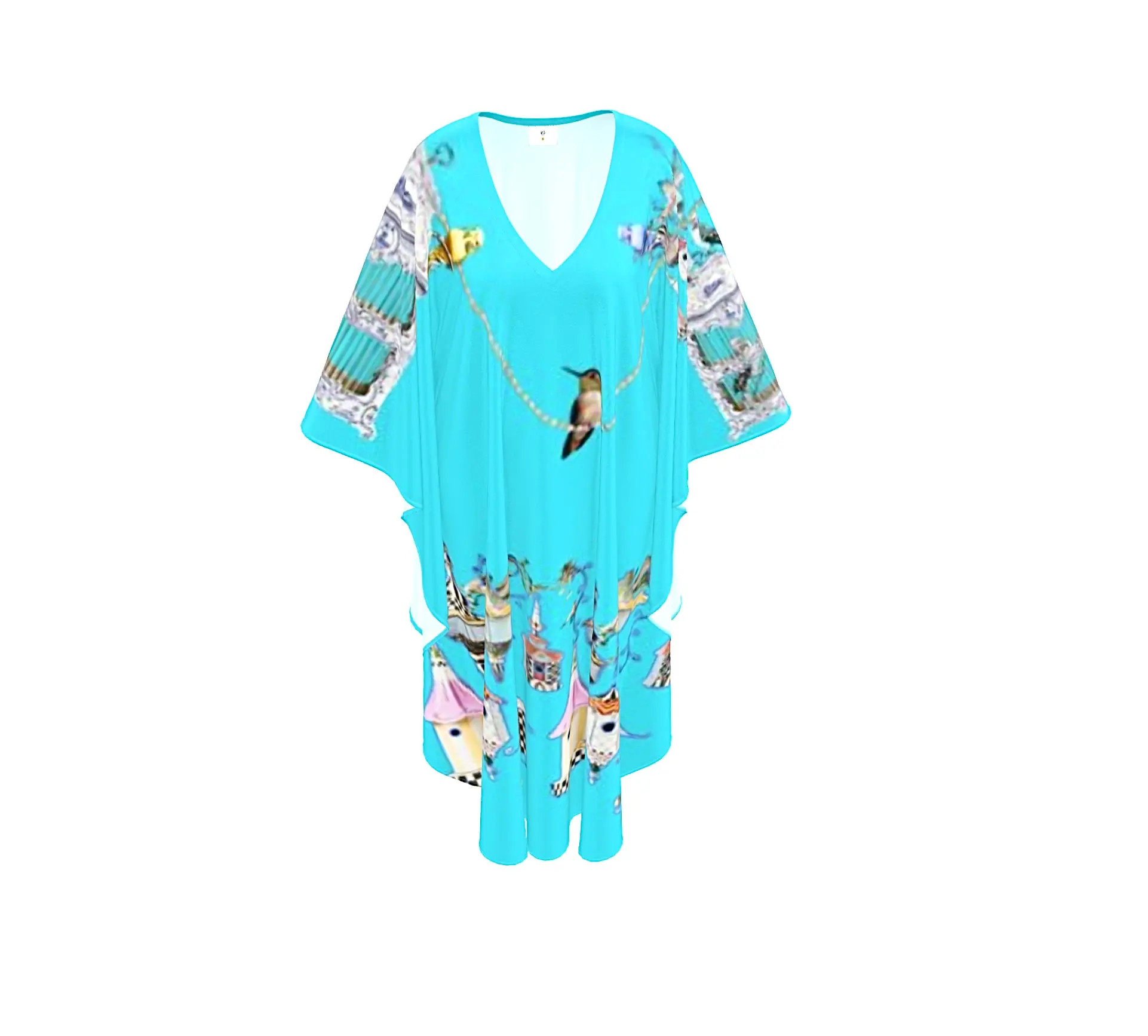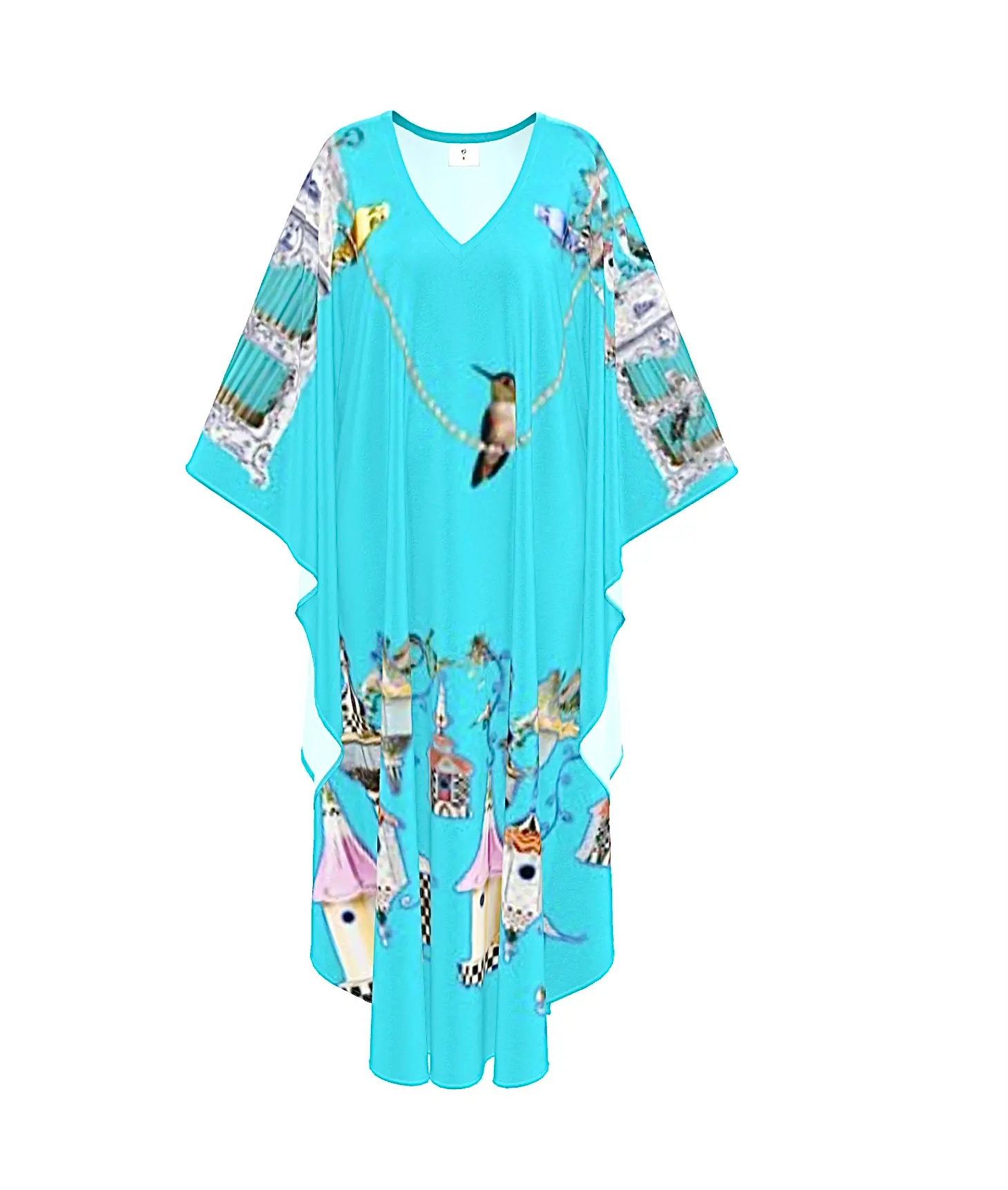 “El Santuario del Colibrí” es un caftán que no solo viste, sino que cuenta una historia. Un colibrí —símbolo de espíritu libre— escapa sutilmente entre pájaros y jaulas apenas insinuadas, para posarse en un refugio de casitas que bordean el dobladillo de esta obra textil. Todo enmarcado por un cielo azul sereno, esta prenda te envuelve en calma, profundidad y propósito.
