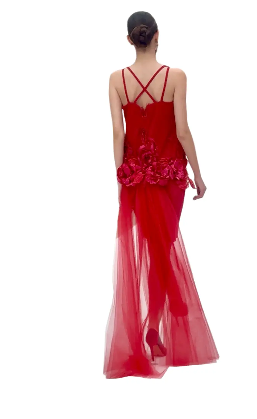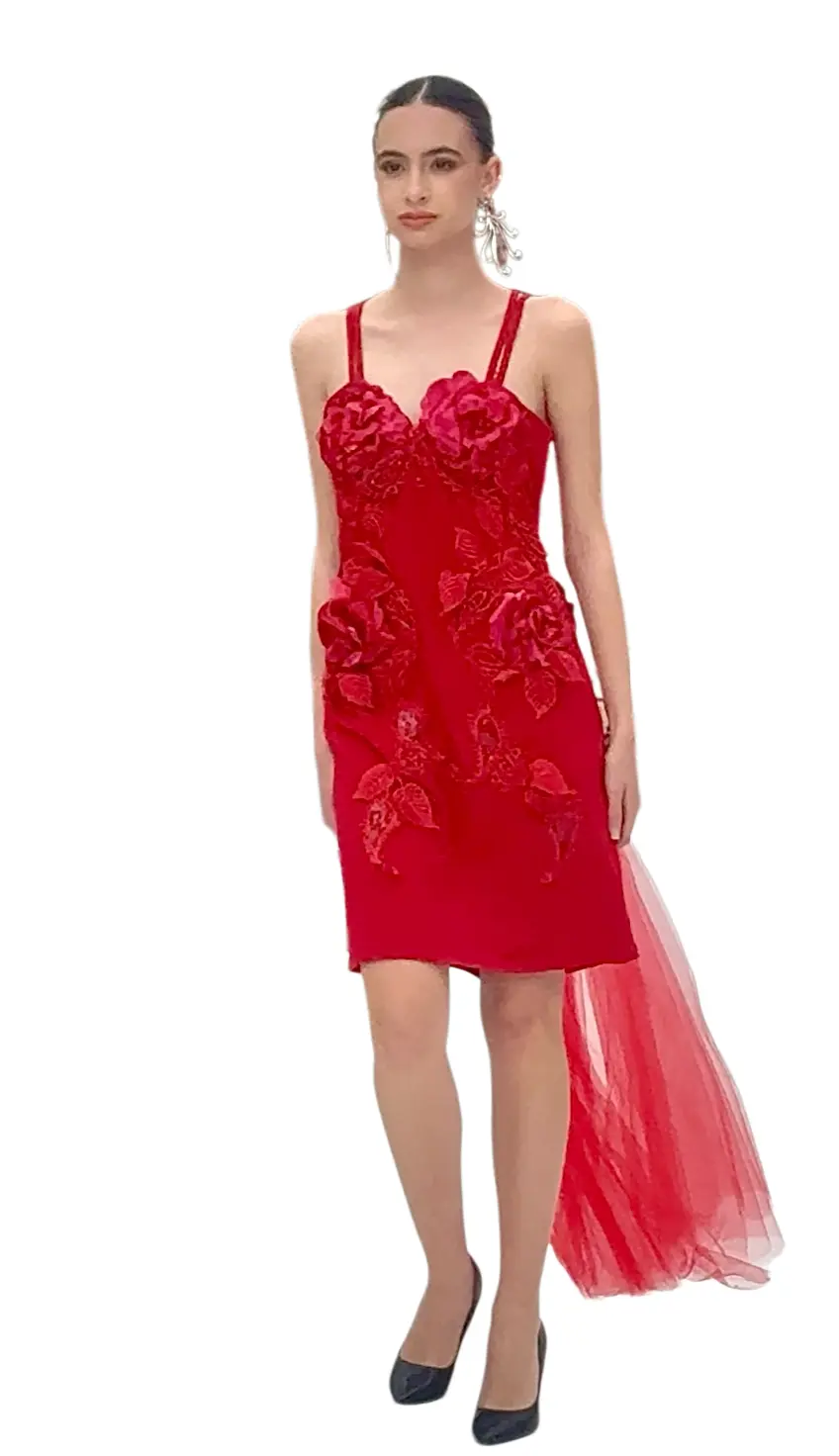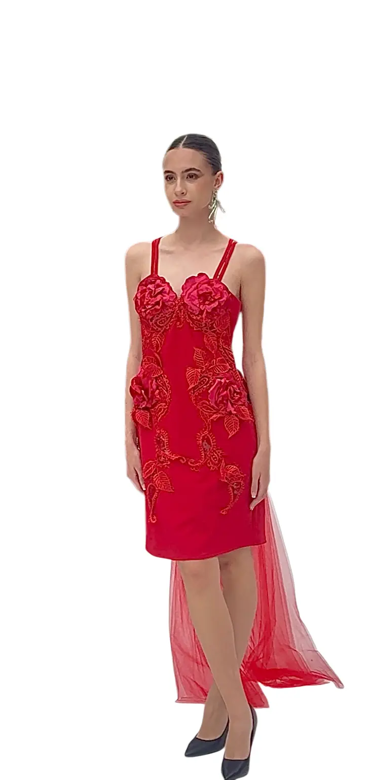 Vestido corto de alta costura en rojo vibrante, con tirantes cruzados, aplicaciones florales tridimensionales y una espectacular cola de tul. Ideal para cócteles, galas y eventos especiales.