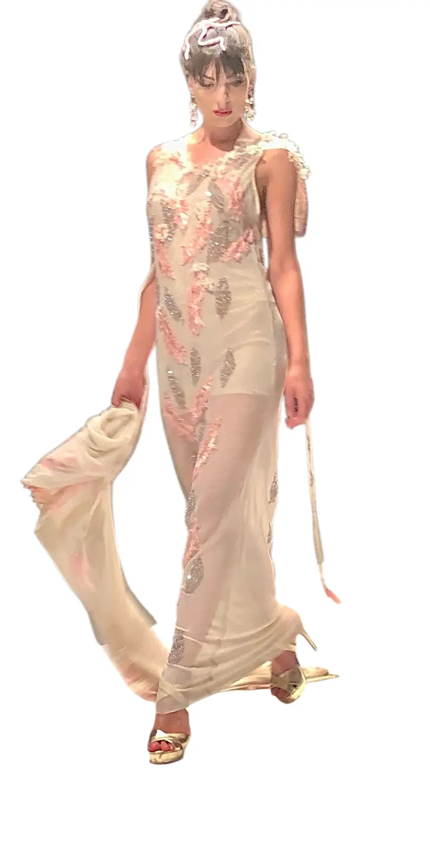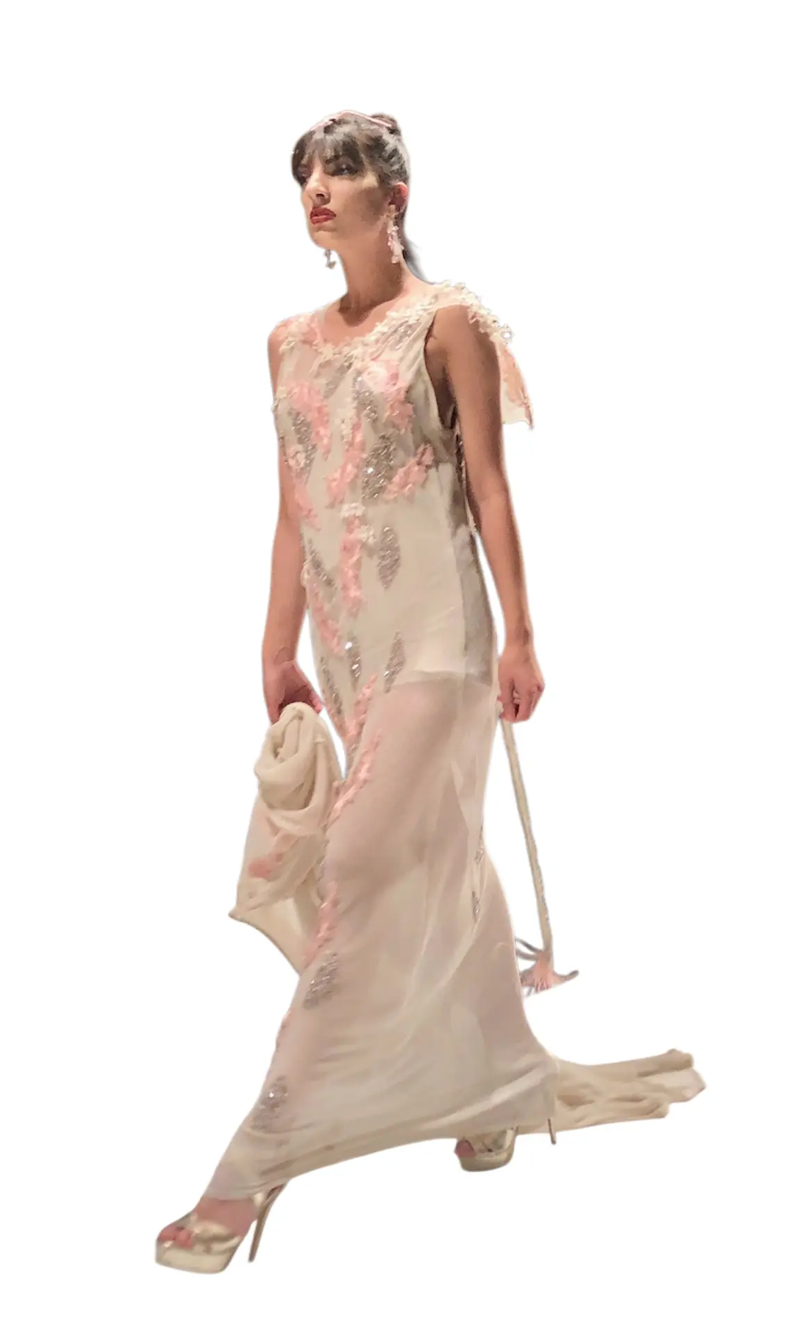 Este diseño de alta costura, en tonos champán inspirados en los años 20, presenta un guardapolvo largo y fluido de tela semitransparente, ricamente adornado con aplicaciones de formas como plumas bordadas en rosa pálido y aplicaciones de perlitas y lentejuelas e hilos en plata y dorado.