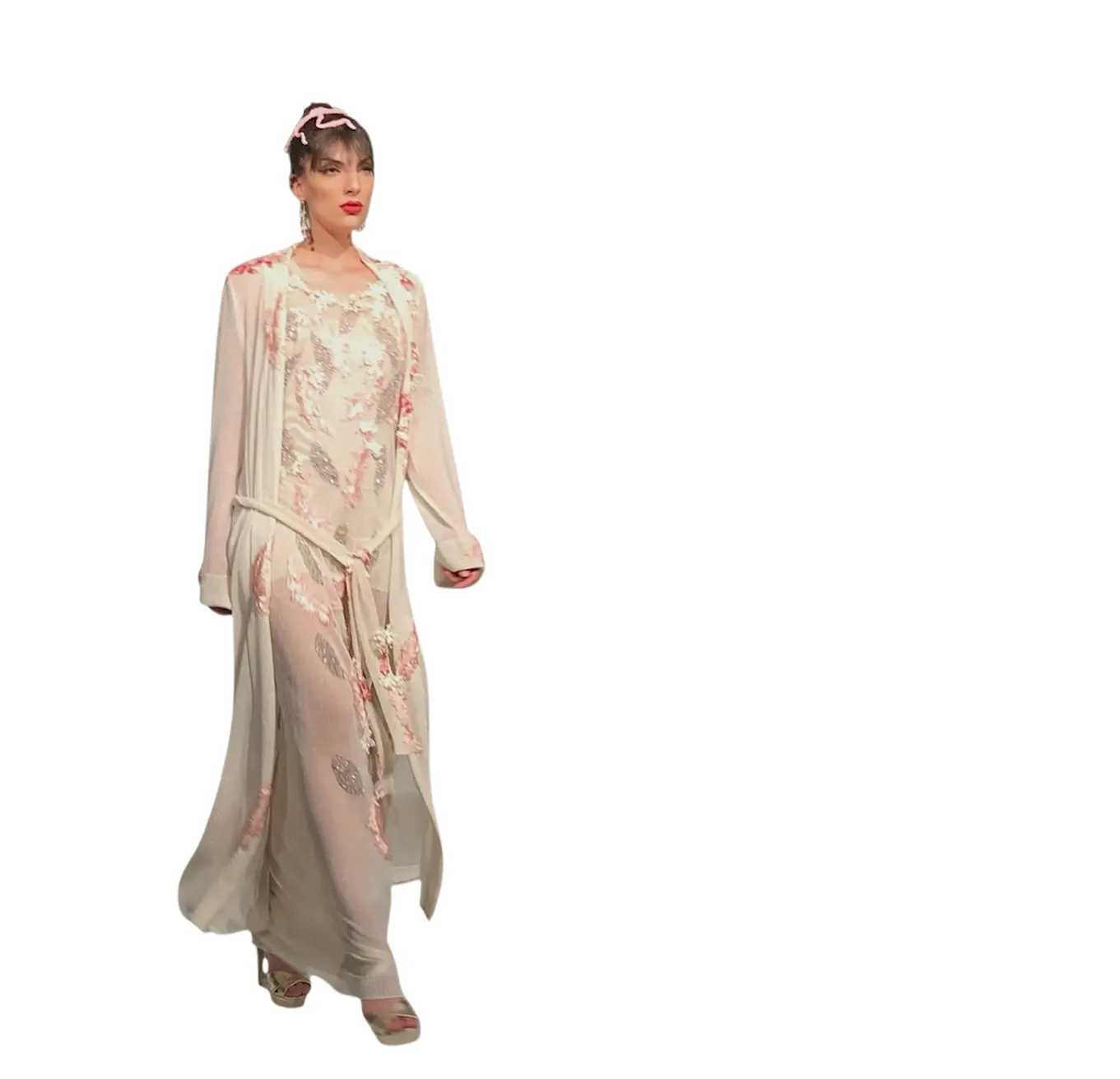 Debajo, se encuentra un vestido recto a juego con detalles de tirantes con cintas de tiras largas con terminación en plumas tono rosa y bordados sutiles. El conjunto irradia una elegancia relajada, femenina y artesanal, perfecta para eventos sofisticados.