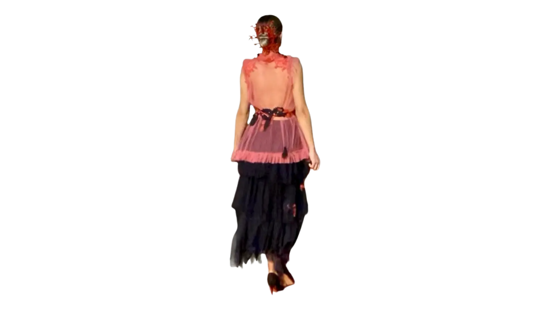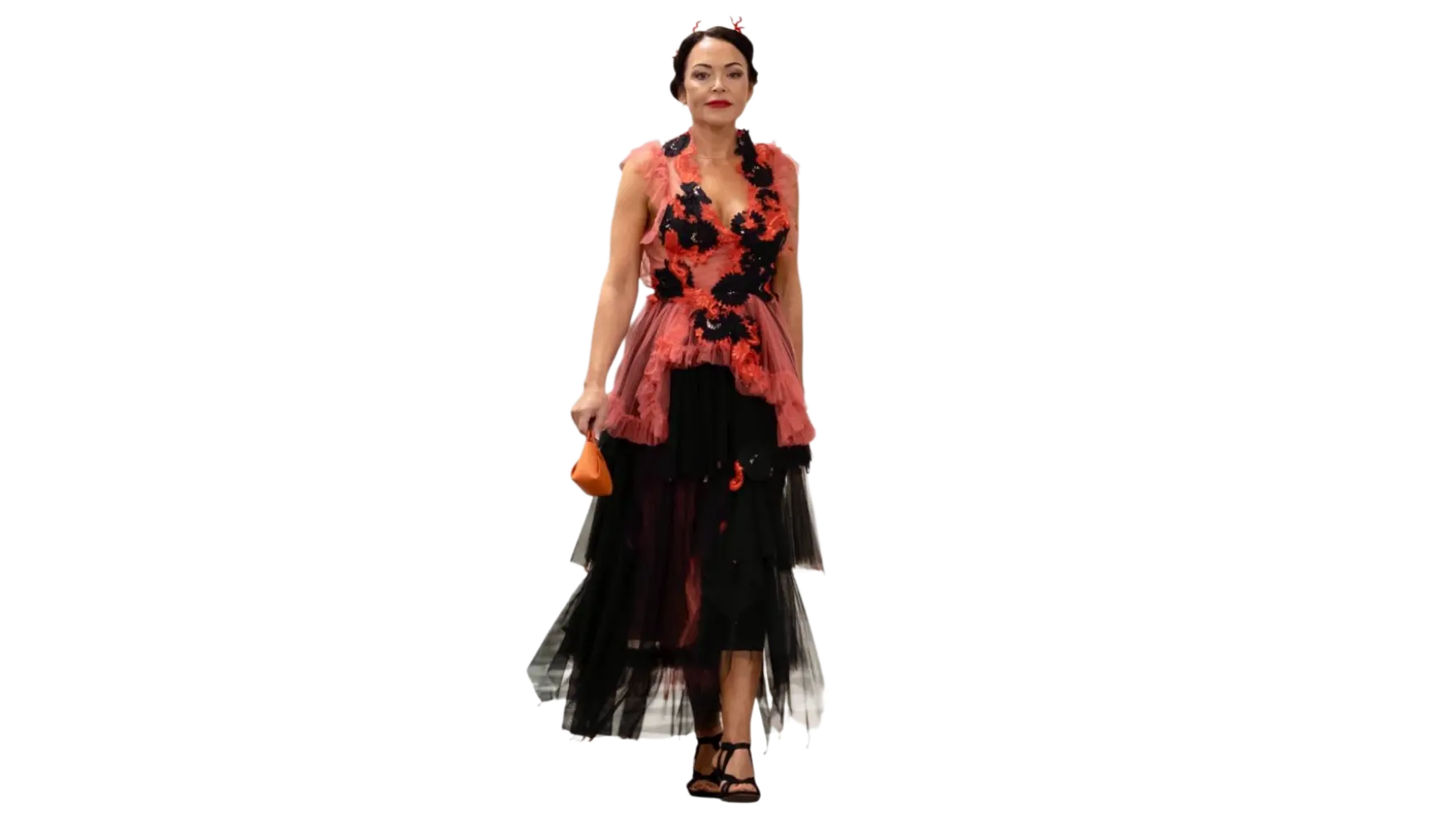 La falda voluminosa está compuesta por múltiples capas asimétricas de tul negro, creando un efecto dinámico.