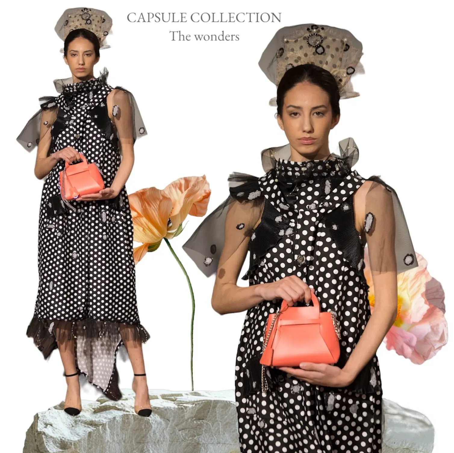 Este vestido incluye un volantón en tul con lunares de diferentes tamaños y lentejuelas, una pieza versátil que puedes llevar como capa sobre los hombros o atado a la cintura, transformando tu look de elegante a aflamencado. El diseño se remata con un cuello redondo adornado con elevaciones en tul y una cascada de perlas, creando un efecto de movimiento y un acabado juguetón y sofisticado.