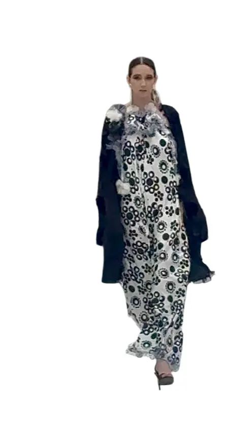 Este es un vestido largo de satén ligeramente elástico, con un llamativo estampado blanco y negro de círculos y motivos florales. Presenta un escote asimétrico recogido al cuello, adornado con pompones de lana escardada o peinada en blanco, y diferentes tamaños distribuidos caprichosamente que añaden un toque juguetón.