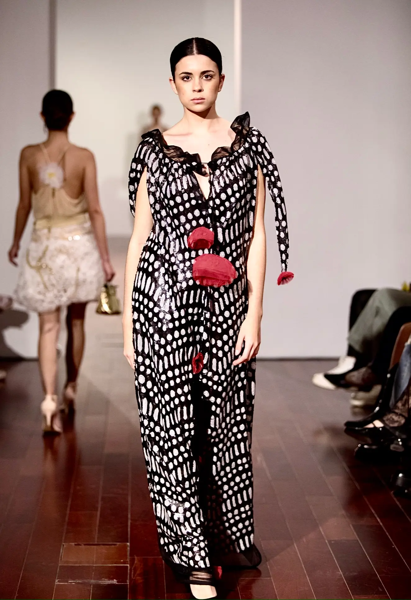 Déjate envolver por el magnetismo de “Susurros de Elegancia”, un vestido largo que combina glamour contemporáneo, arte abstracto y detalles florales hechos a mano. Esta creación de alta costura es un homenaje a la naturaleza y el movimiento libre, con una estética sofisticada y audaz.