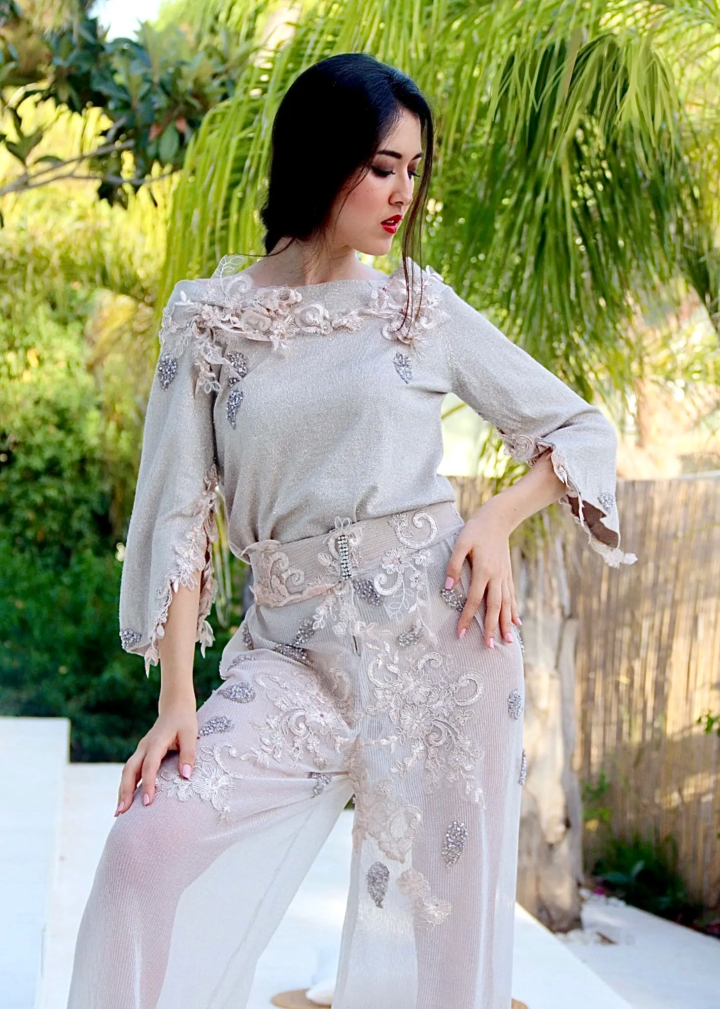 Sutil Chic – Conjunto de Jersey y Pantalón con Encaje, Cristales y Pedrería