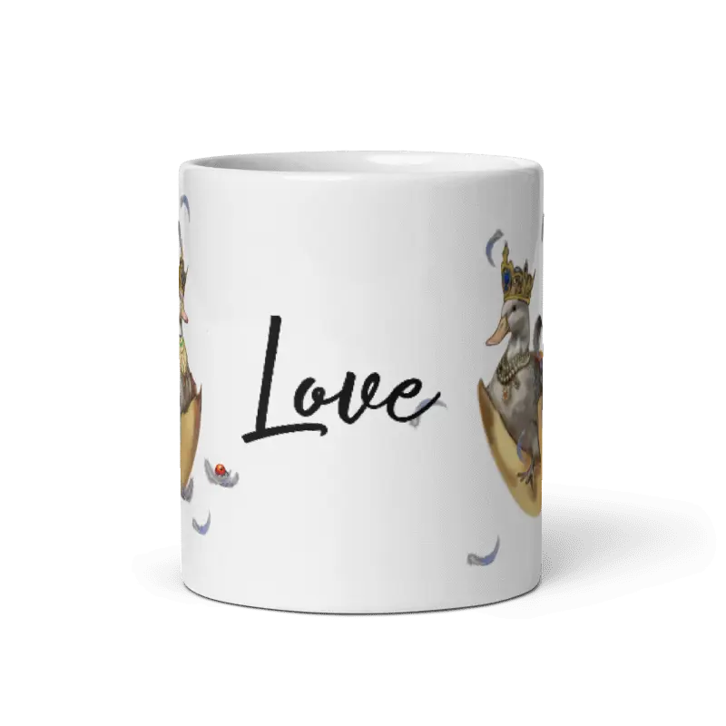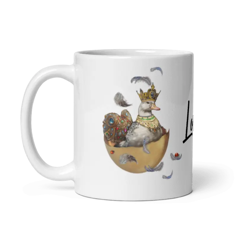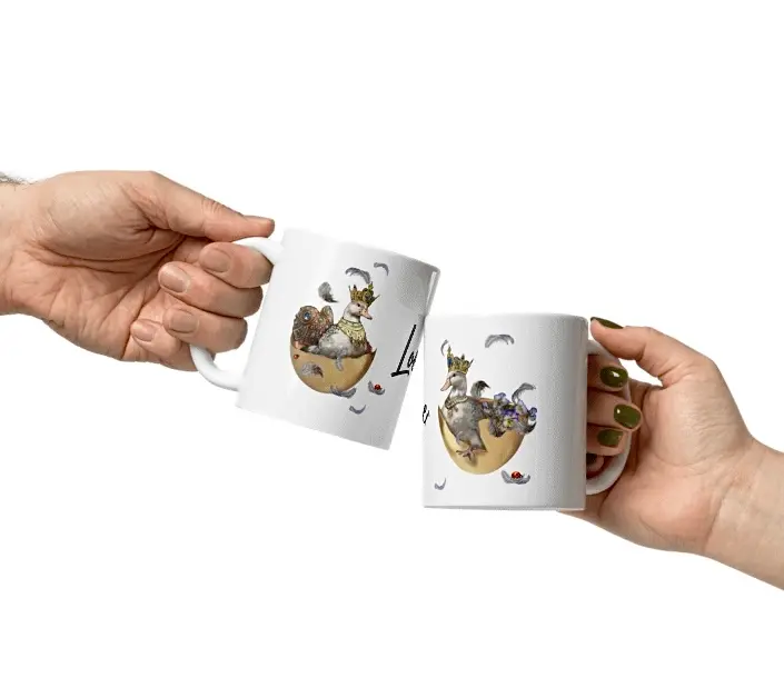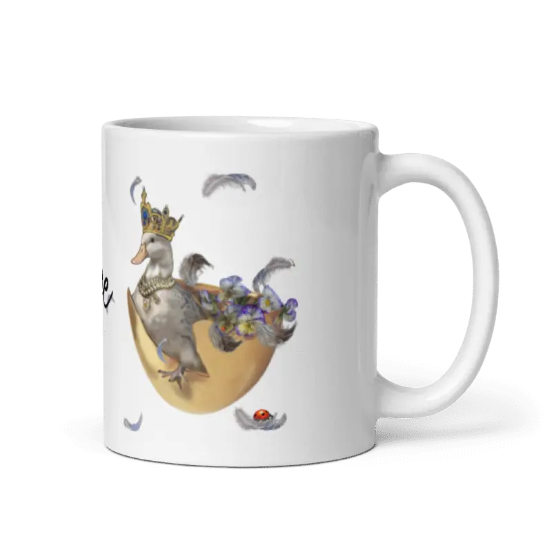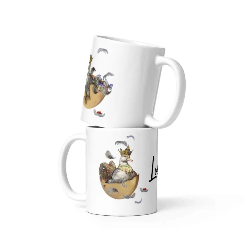 Unos huevos dorados mágicos, olvidados en un jardín encantado, se abren bajo la luz de la luna para revelar a una pareja de patitos reales con coronas y joyas. Las plumas circundantes son gemas preciosas de su cuna. Estos “Patitos Reales” emprenderán un viaje para reclamar su lugar. Beber de esta taza infunde magia y recuerda que la grandeza puede surgir de orígenes inesperados.