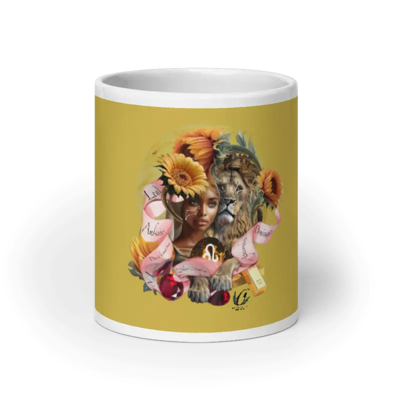 El diseño central destaca por elementos simbólicos como el león, poderoso y noble, y las flores de girasol, que reflejan la luz, la vitalidad y la alegría propias de los Leo. Los colores cálidos y dorados del fondo evocan la energía del sol, planeta regente de este signo.