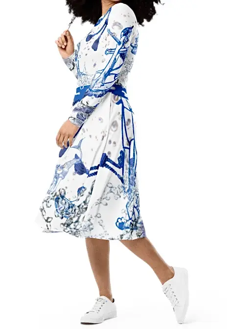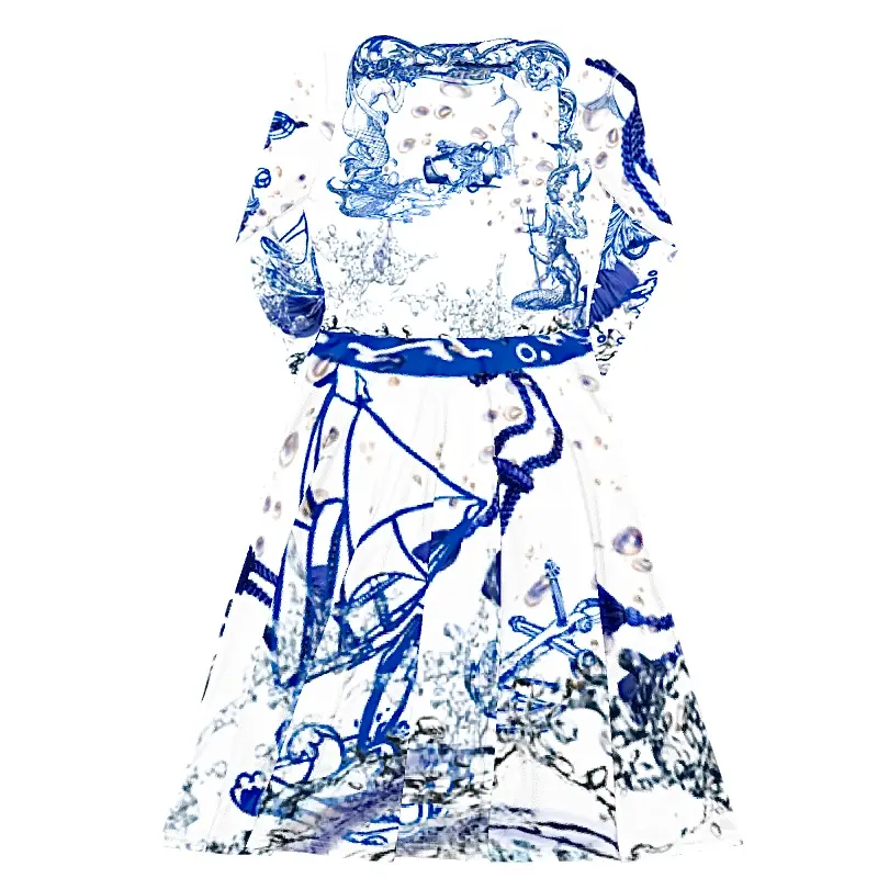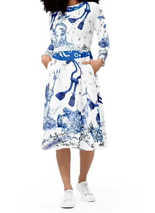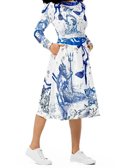 Este vestido midi de manga larga con estampado all-over es un espectáculo para todas las que disfrutan llevando vestidos. Diseñado como un lienzo blanco donde elegir salpicarlo de azul marino, narra la leyenda submarina de Neptuno y las sirenas. Captura la majestad del dios del mar, el encanto de las ninfas acuáticas y el dinamismo del océano, sumergiéndote en un cuento de mitos y profundidades marinas.